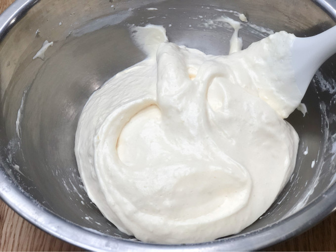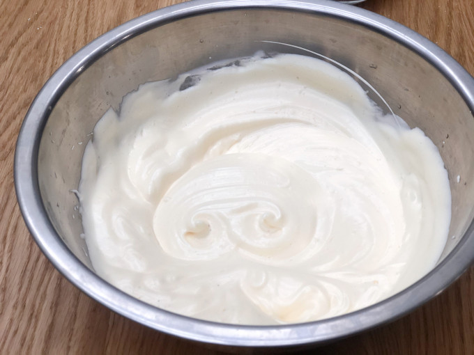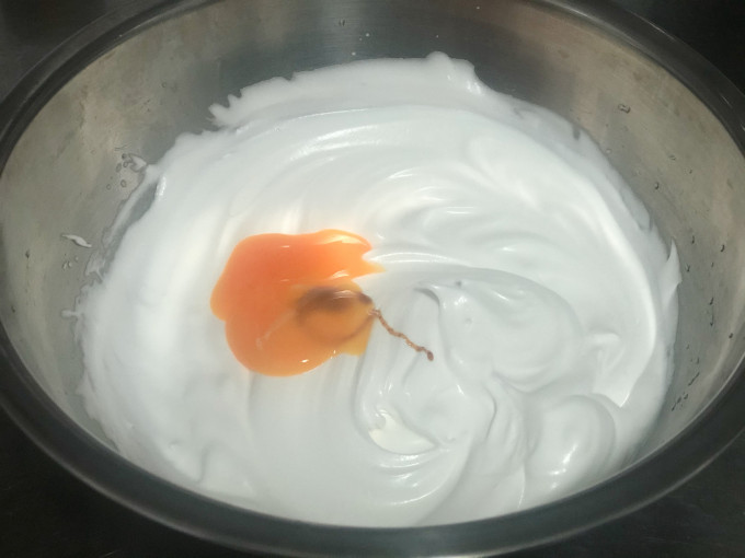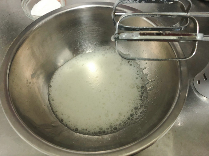 將蛋白與蛋黃分開,蛋白先打至起泡。