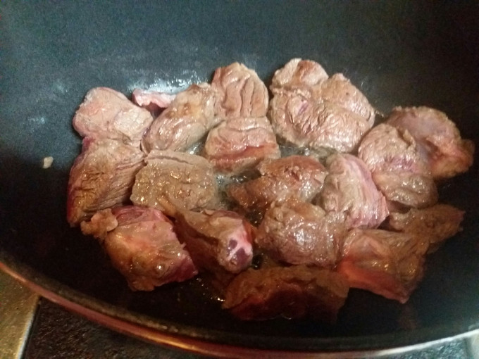 鑄鐵鍋下1大匙油,放入牛腱塊,2面煎香。看到這畫面,突然想改吃牛排😆