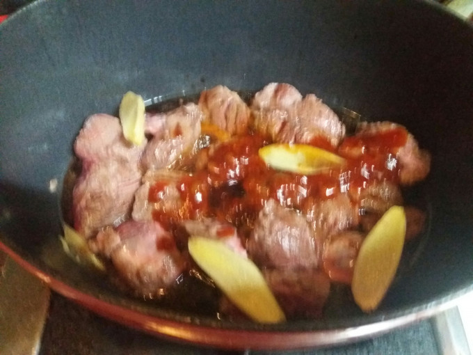 放薑片,醬油,糖,辣豆瓣醬,使醬料與牛腱緊緊的密合~😗