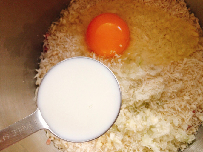 倒入洋蔥末、蒜末、麵包粉
