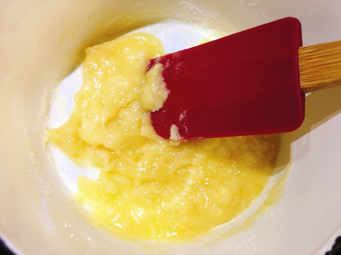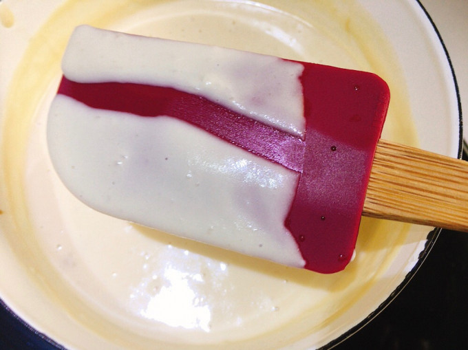 攪拌至濃稠,刮刀上可以劃出一道痕跡短暫停留就可以