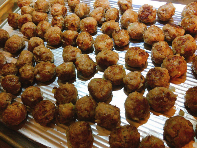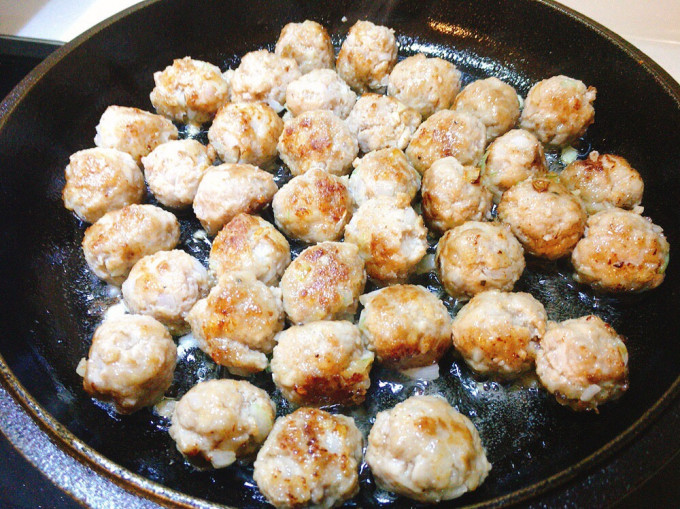 平底鍋加少許橄欖油,將肉丸煎至金黃微焦