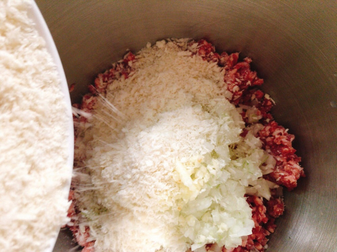 攪拌缽中放入牛、豬絞肉
