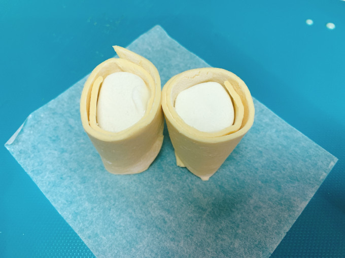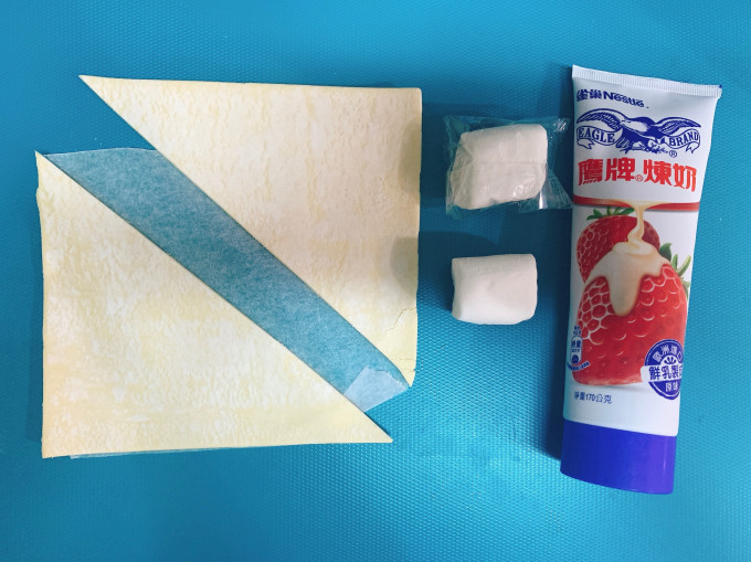 先用煉乳將棉花糖黏在酥皮上,再把棉花糖包起來。(包起來後要留一個開口,讓棉花糖膨脹用)