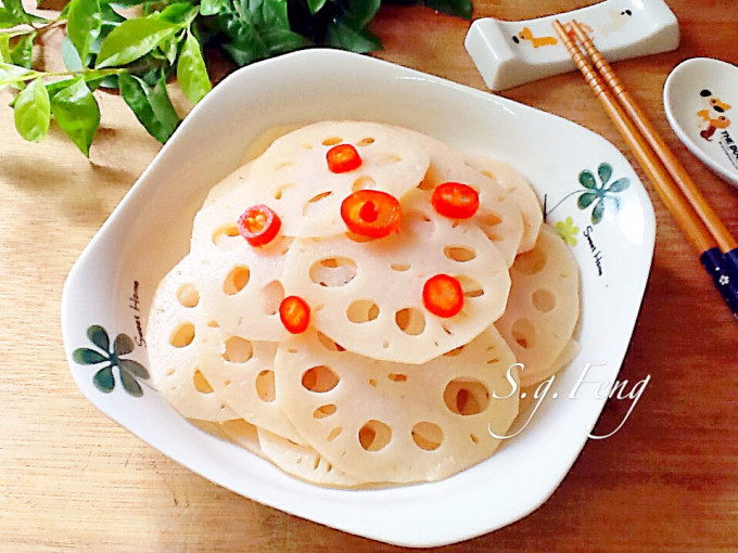 食材與做法都很簡單,經糖與醋醃漬後,藕片微辣酸甜脆口,是一道很開胃的小菜喔!