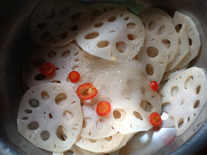 6.取出蓮藕片瀝乾,加入白醋、糖、辣椒,攪拌至糖溶解,放置醃漬約2小時入味(其中適時的翻動一下藕片,使其均勻入味)即可食用。