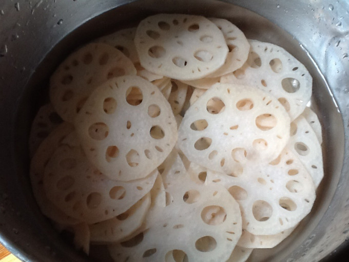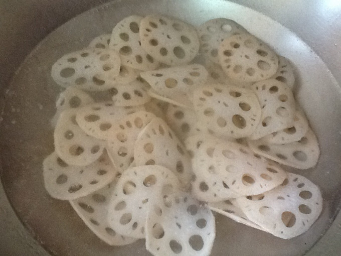 5.撈起放入冷開水(冰水)中降溫,使蓮藕片快速冷卻。