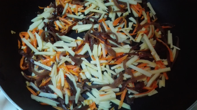 下黑木耳絲炒熟;下竹筍絲翻炒均勻。