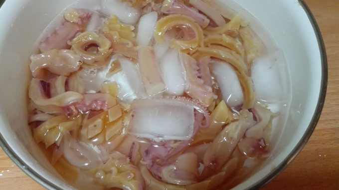 起一鍋熱水,川燙魷魚,然後以冰水冰鎮備用;煮熟竹筍,切絲備用。