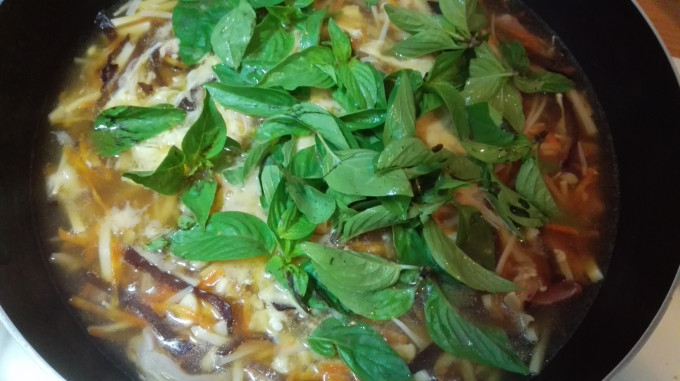 放入九層塔,以鹽、胡椒粉調味後,即可完成,食用時,放入沙茶拌佐。