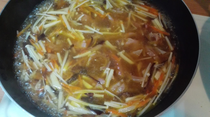 下醬油、烏醋、米酒,煮滾。