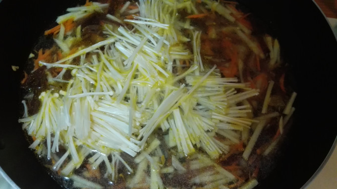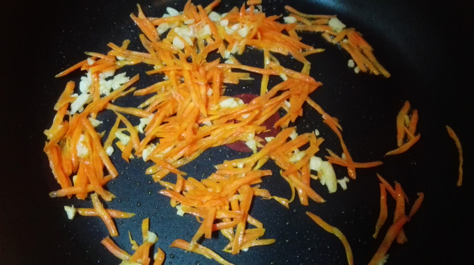 起油鍋,下蒜末爆香,下紅蘿蔔絲炒軟。
