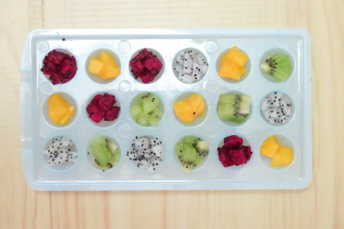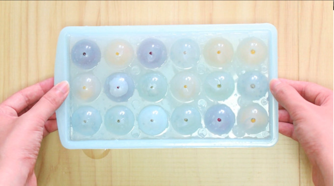 洋菜粉放入水裡加熱至全部溶解,再填入製冰盒裡 把上蓋放上去,洋菜會稍稍溢出沒有關係