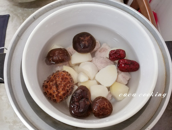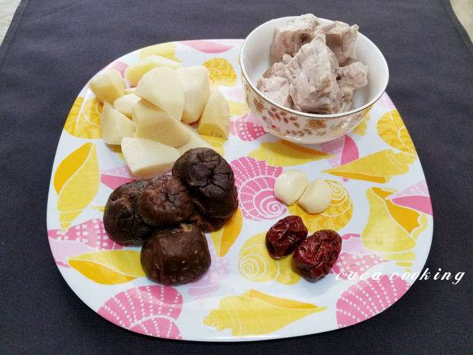 準備一個湯鍋,水量裝6分滿,把香菇、竹筍、排骨、紅棗、蒜頭放入,以電鍋來燉煮,外鍋放3米杯量的水。