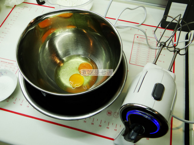 雞蛋加入砂糖,先攪散,打蛋盆下放一鍋溫熱水,幫助全蛋打發