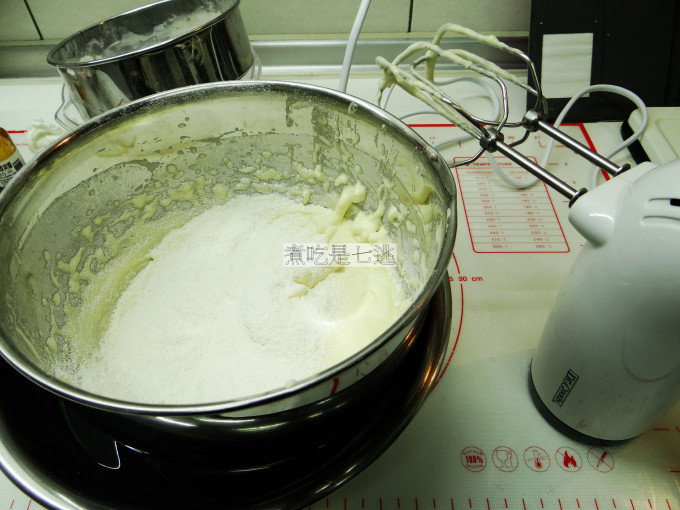 然後分2-3次篩入低筋麵粉,用電動打蛋器低速檔(1檔),攪拌均勻,不用攪太久。(麵粉先過篩3-4遍)