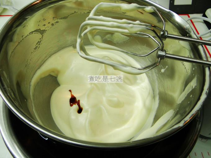 用高速打發,打到蛋糊拉起來,滴落有明顯折疊狀(電動打蛋器需打8-10分鐘)。雞蛋糊一定要打發到位,不然出爐後,雞蛋糕會塌 。如果怕有蛋腥味,可以加一點香草莢醬(精)