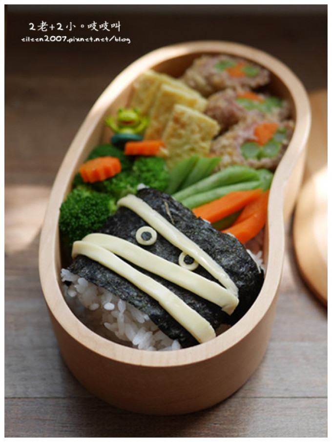 簡單用海苔片包上白飯,將起士片壓出圓形當成眼白,壓海苔器壓出黑眼球,小剪刀剪出長條狀起士當木乃伊的繃帶,就可以變出可愛的木乃伊囉~