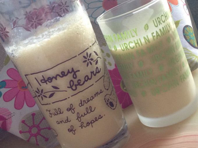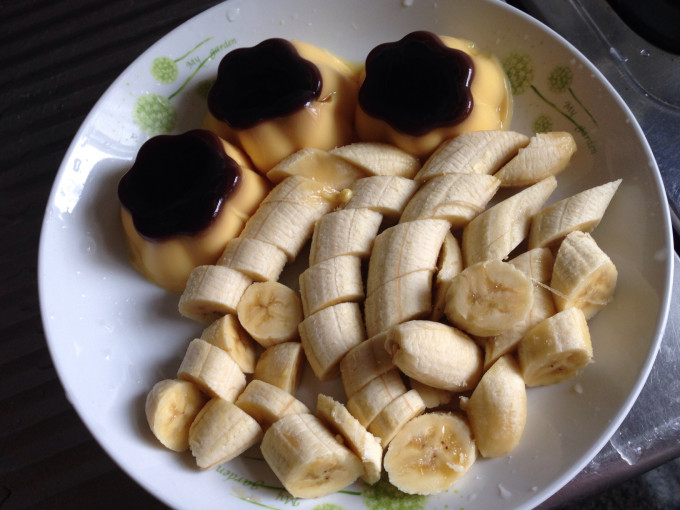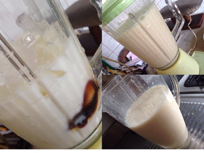 1.放2根香蕉量、1盒布丁、冰塊及適量的牛奶攪拌均勻 2.分三次製作