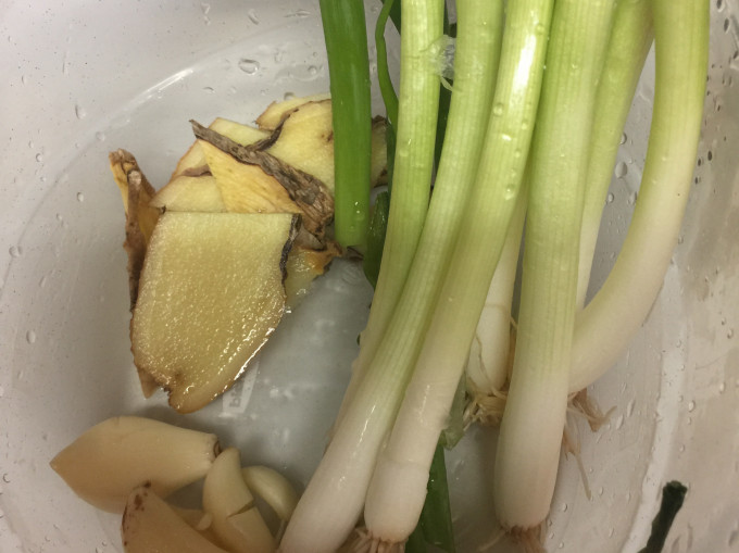 準備好蔥薑蒜洗淨後與牛腱肉一起放人壓力鍋開火烤(牛腱肉此時可以切一半放進去比較易熟)