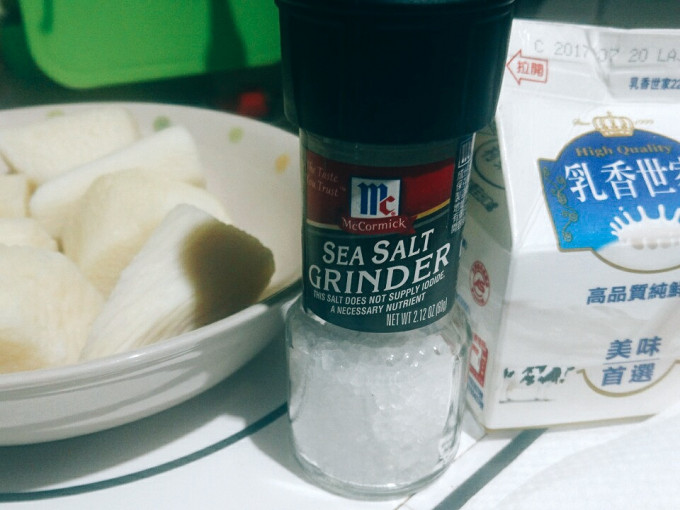 山藥先削皮切塊,3*5cm的大小8塊大概是2人份的量。 將山藥放入電鍋蒸約15分鐘(大概8分熟)