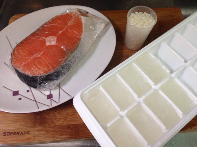 1.白米稍洗,鍋內放入蔬果高湯冰磚及水 2.煮滾5分鍾 3.放入鮭魚碎肉 4.稍滾一下關火 5.放入燜燒罐2~3小時