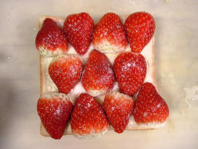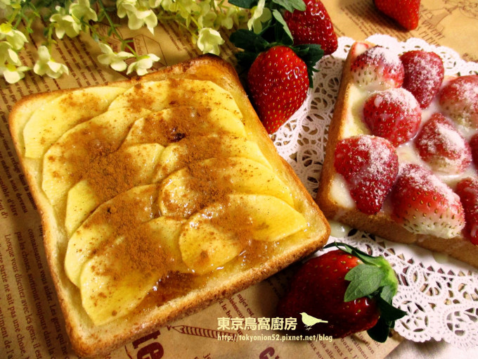 吐司抹上奶油或乳瑪琳,再鋪上水果片,口味吐司撒上糖粉,口味吐司撒上糖粉和肉桂粉。