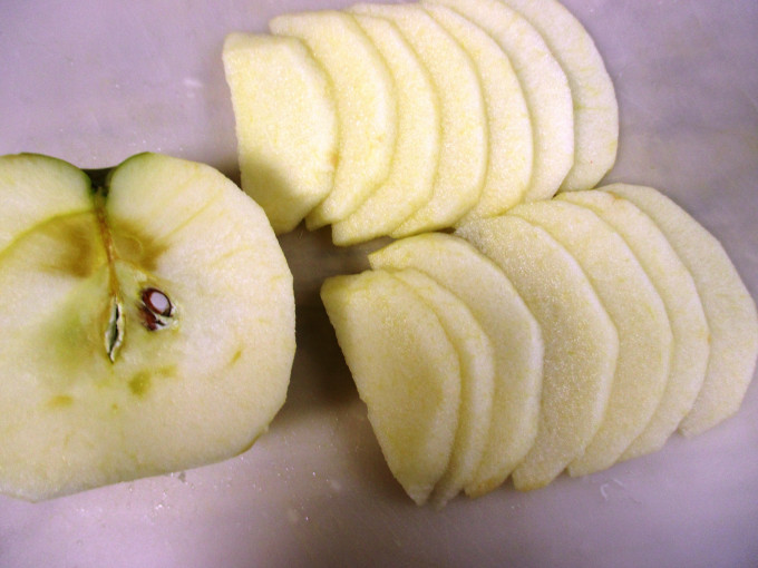 蘋果去皮去芯切薄片,草莓洗淨切對半。