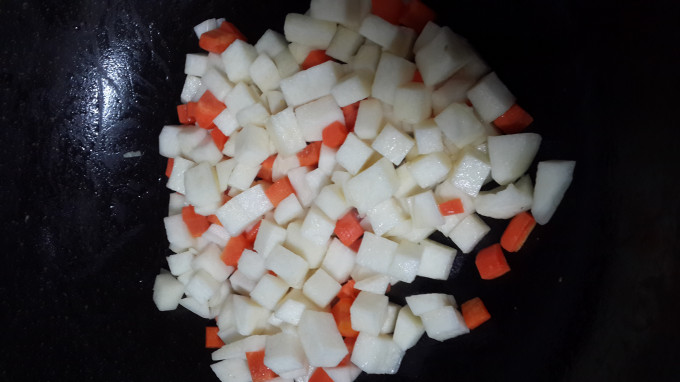 涼薯去皮切丁,紅蘿蔔切丁備用~