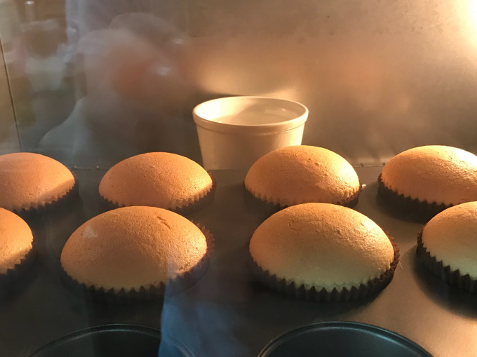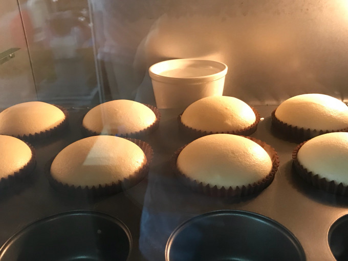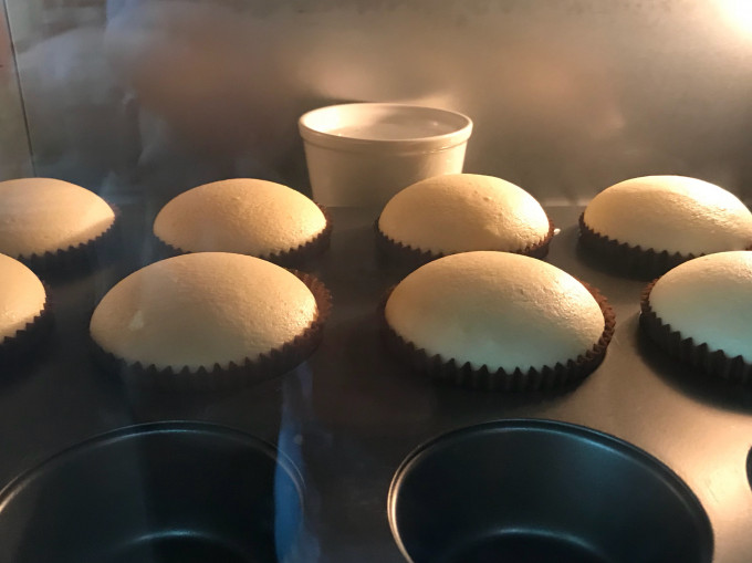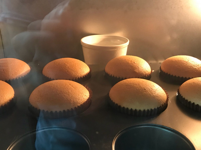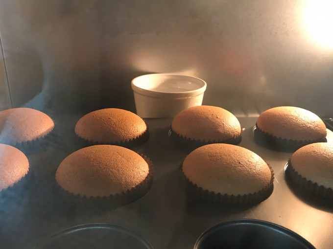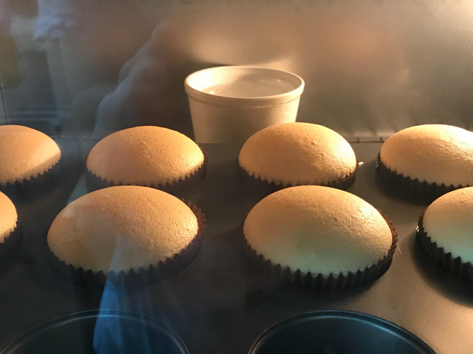 杯子蛋糕放在烤箱正中央,下層,旁邊放杯水增加烤箱內濕度(不是水浴!)