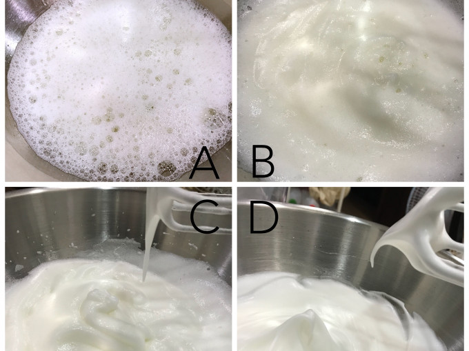 圖A.用電動打蛋器打出粗泡加入檸檬汁or白醋、1/3細砂糖。