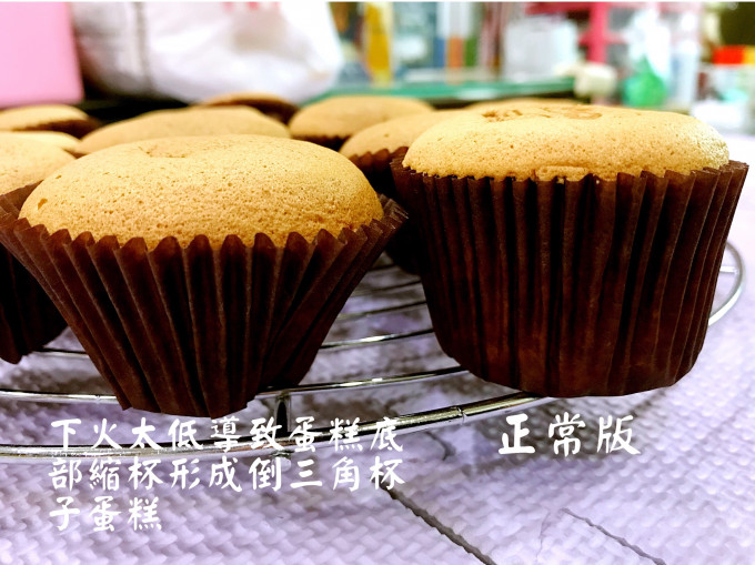 💡底火太高,底部烘烤過度,導致蛋糕底部凹陷,下火要降溫10~20度。
