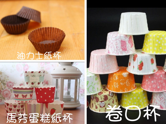我發現用馬芬蛋糕紙杯(左下)製作戚風杯子蛋糕突發狀況還滿多的,後來直接一慣性的使用油力士紙杯(左上),油力士紙杯也是最便宜的,但是需要搭配烤模才能使用,至於右圖的卷口杯效果也不錯。