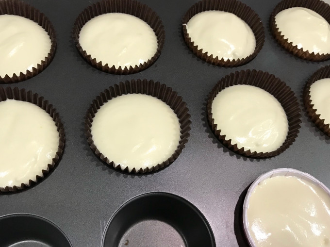 麵糊裝在擠花袋中,填入油力士紙杯8分滿,抹平表面,連同烤模在桌面上震幾下震出氣泡