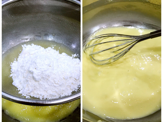 蛋黃糊~加入過篩的低筋麵粉,攪拌均勻完成乳化作業,手法動作要輕,混勻到看不見粉即可。