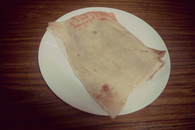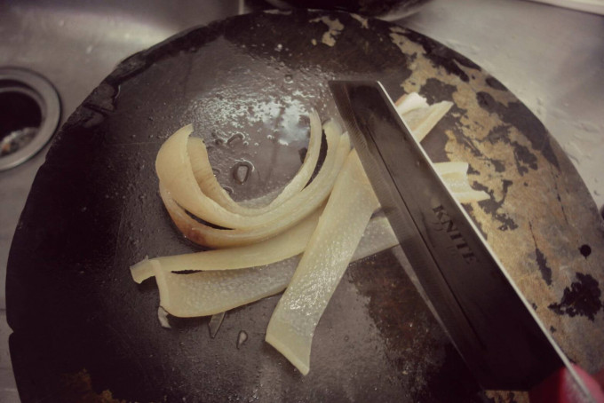 ※Tip:先將豬皮以滾水燙煮10分鐘左右,皮質會軟化比較好切喔!!