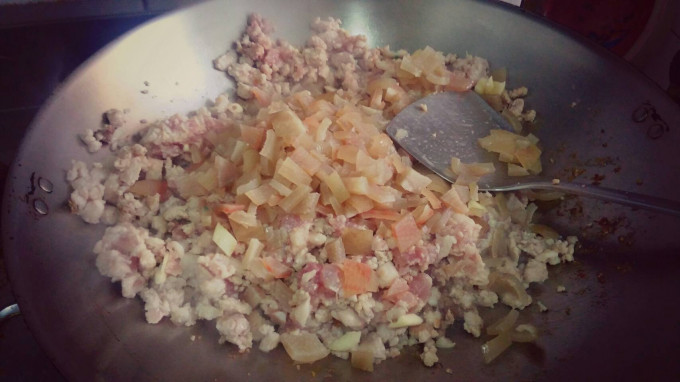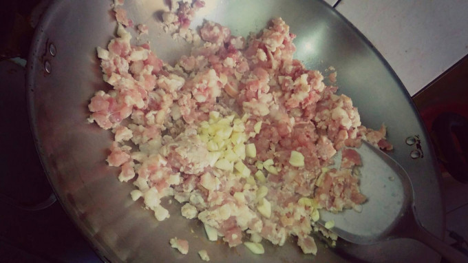 再放入豬絞肉拌炒一下
