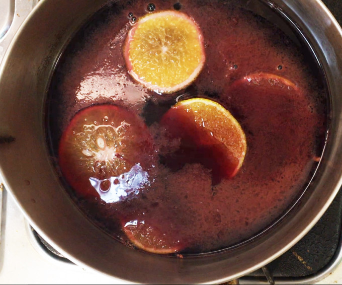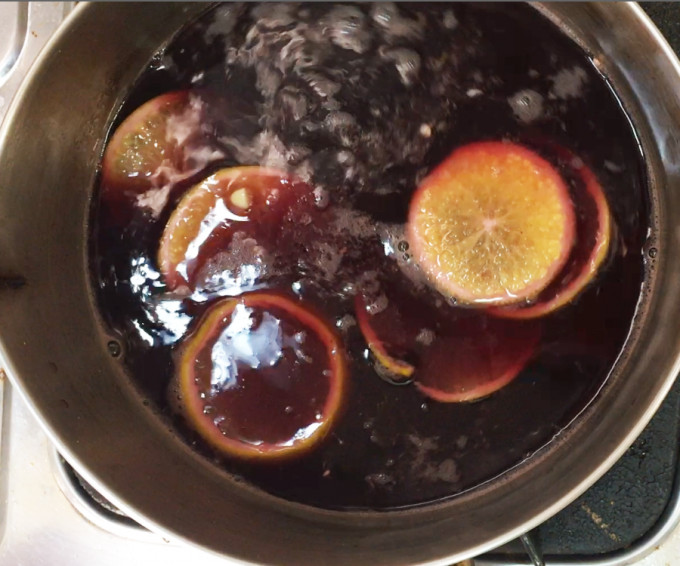 600 c.c. 熱紅酒小火加熱,加入柳橙汁、柳橙片、40g 二砂(可酌量減少 5-10 g)、肉桂條 1-2 條、肉豆蔻粉 1 茶匙,攪拌均勻