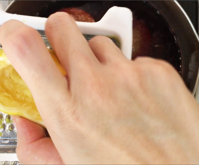 利用刨刀刨下適量柳橙皮,注意刨表層即可,白色的部分會苦,不要刨到喔