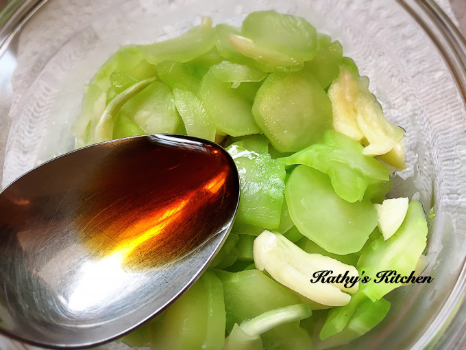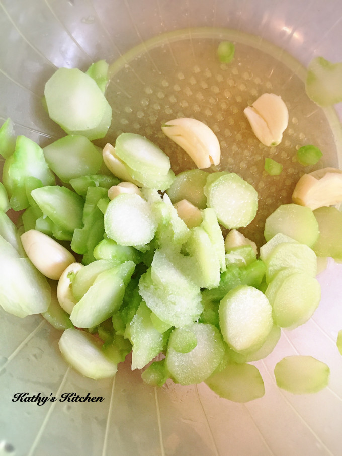 倒入適量的海鹽,進行殺青;讓鹽滲入菜心、蒜頭,置放十分鐘左右。