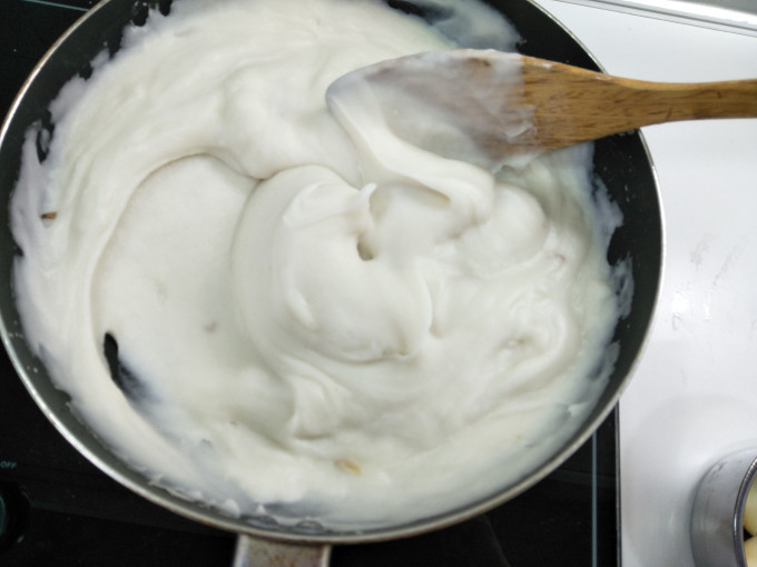 在來米漿的部份,在來米粉和玉米粉用冷水300g拌勻,再加入油和鹽,再將水750g煮沸快速倒入米漿並拌勻,如果沒有呈糊狀,就放瓦斯爐上小火加熱一邊攪拌,呈糊狀就要熄火。