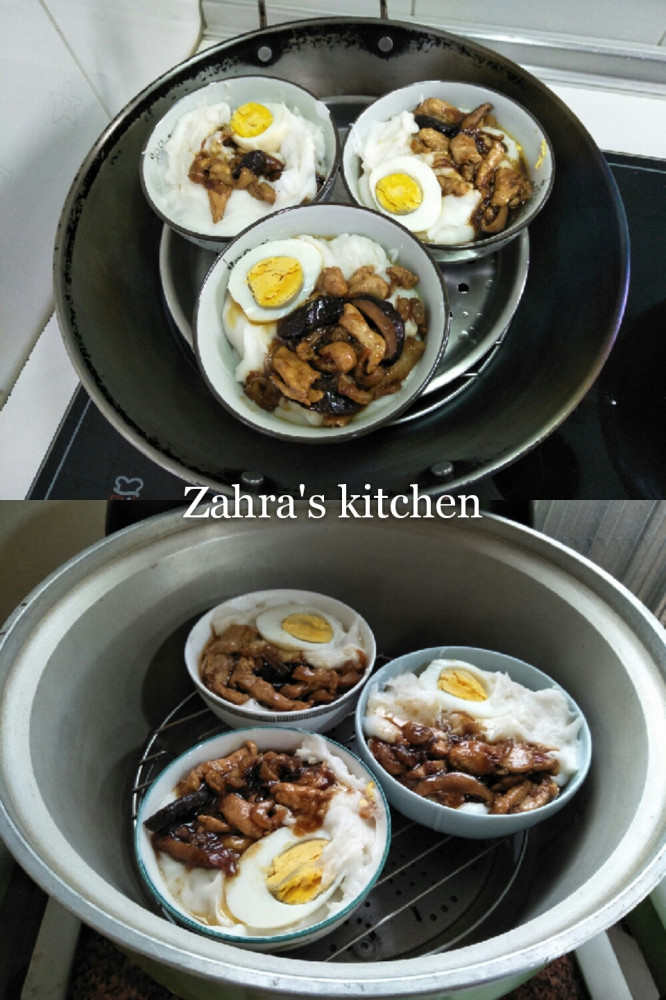 再將米糊蓋上雞肉燥抹平。電鍋內放上蒸架,再放上碗粿,外鍋放1杯的水,並蓋上鍋蓋,等待開關跳起,繼續燜10分鐘,就可以拿起來,碗粿微溫就可以淋上油膏一起吃了。(也可以在瓦斯爐上蒸,時間為20分鐘)。