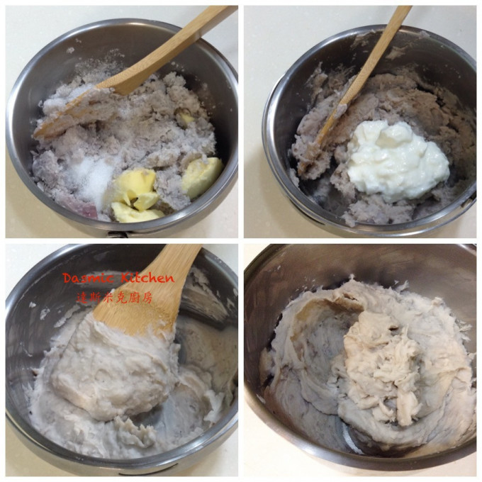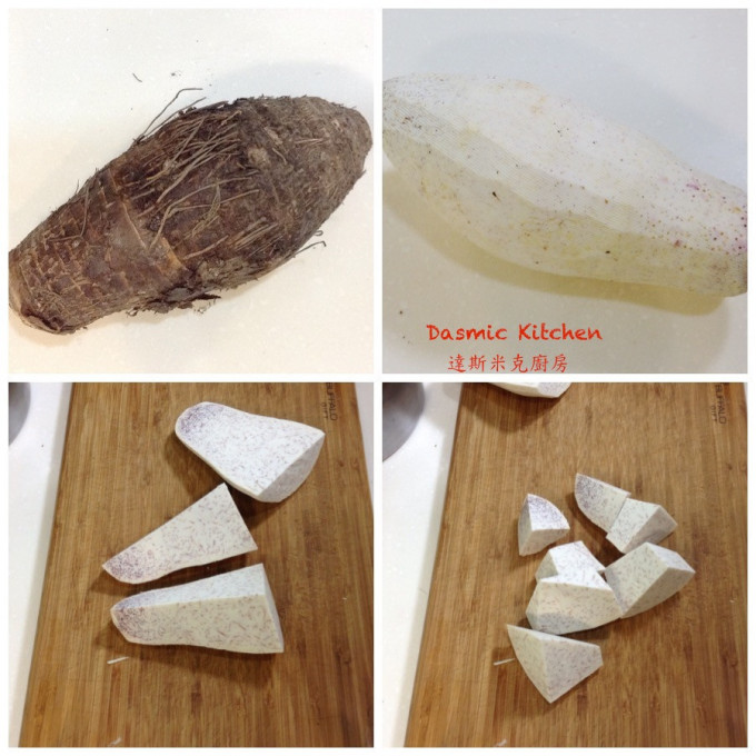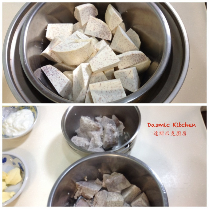 蒸煮芋頭: (帶手套)削皮、切大塊, 放入電鍋內鍋中,外鍋倒入2米杯水,蒸煮至熟透,