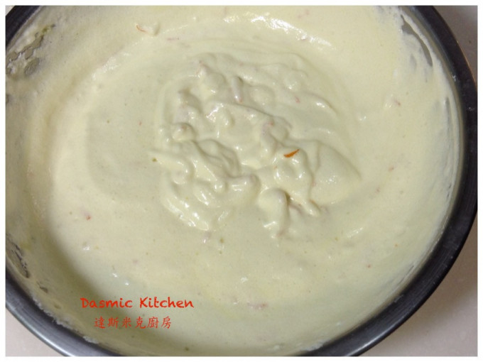 倒入平盤 (21x29cm) 中, 用刮刀將表面抹平, 拿起平盤往桌面輕敲幾下, 敲出空氣來
