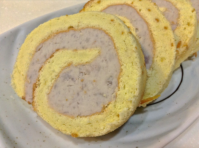 將蛋糕短向面對自己, 塗抹芋泥優格餡,輕劃2-3刀( 以免捲起時斷裂但不要切到底!)