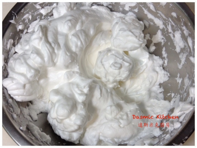 蛋白放入另一個較大鋼盆中, 加入白醋, 用電動攪拌器先以低速打出大氣泡(約30秒), 加入1/3砂糖, 以中速攪打約1分鐘; 再倒入1/3砂糖,以中速攪打約1分鐘; 最後加入剩餘1/3砂糖,以高速攪打約5分鐘成尾端挺立之蛋白霜 (全程約8分鐘)