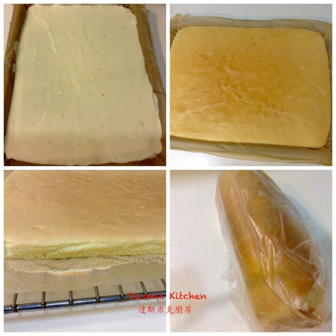 將蛋糕由內往外慢慢 且緊緊 捲起, 並以原來的烘焙紙包好, 再用塑膠袋包裹好