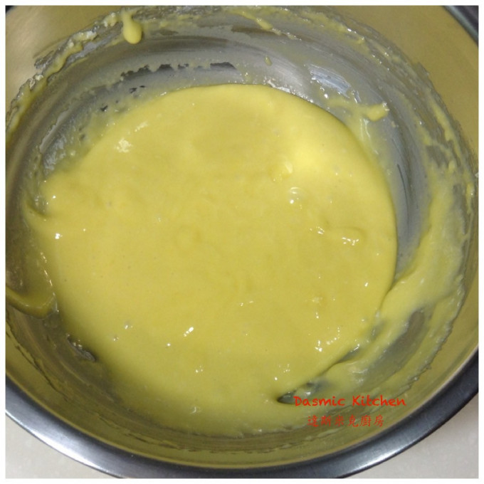 舀出1/3蛋白霜倒入蛋黃麵糊中, 以長柄塑膠刮刀輕輕拌勻