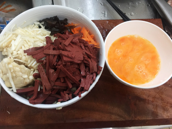 所有材料切絲、蛋打勻備用