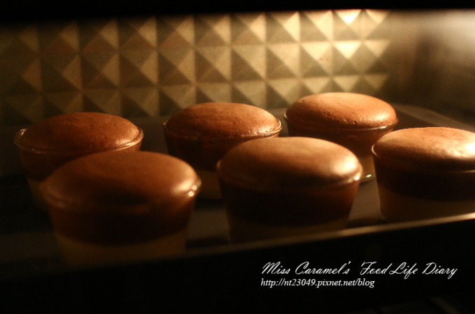 再烤盤中倒入熱水約一半的量 用水浴法來烘烤